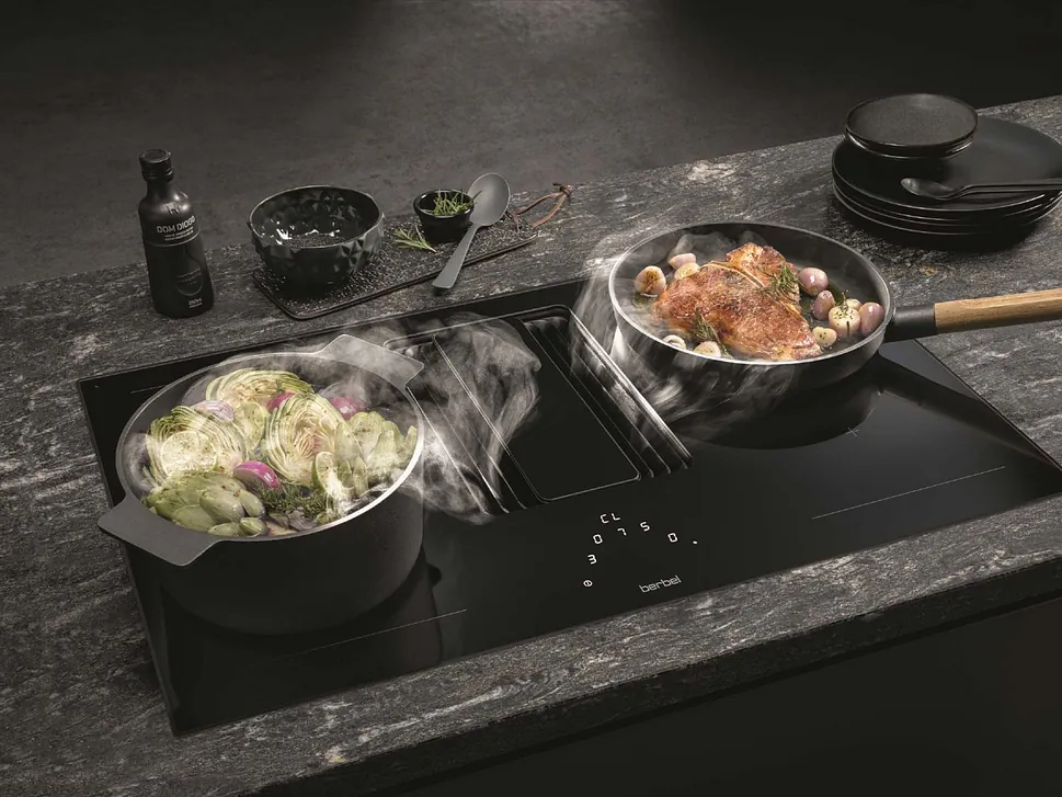 Unsere Partnerfirma Berbel hat die Funktionsweise der Dunstabzugshaube revolutioniert: Das patentierte Berbel Prinzip filtert die Wrasen über der Kochstelle ohne Fettfilter.