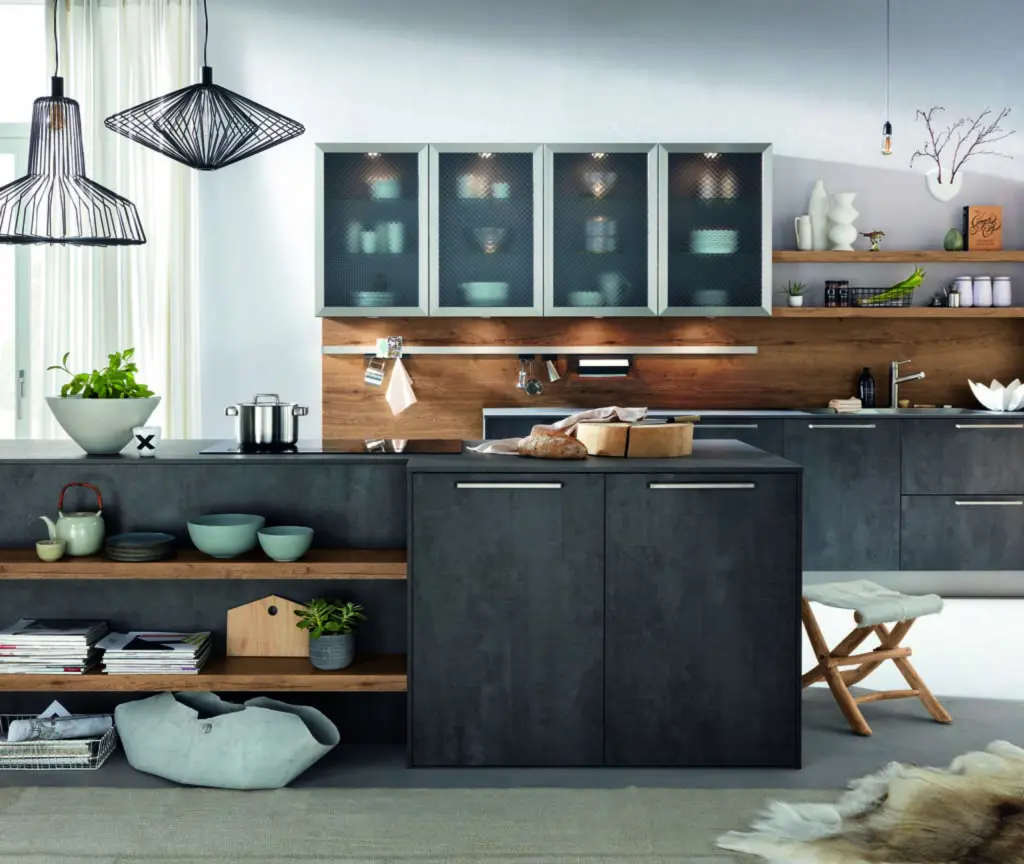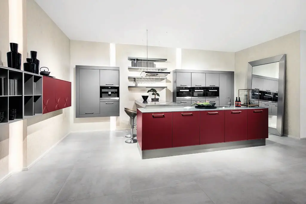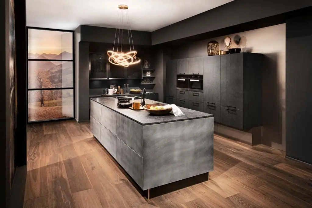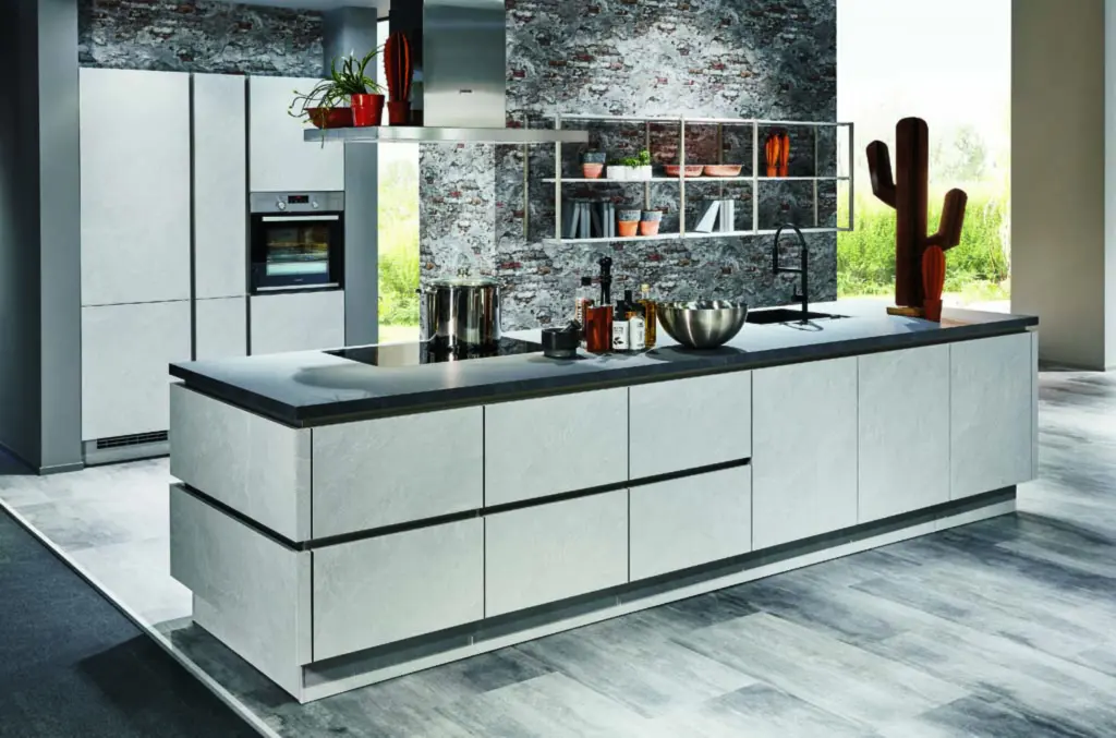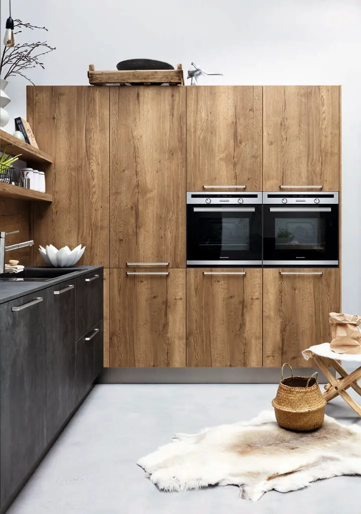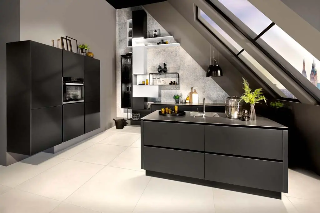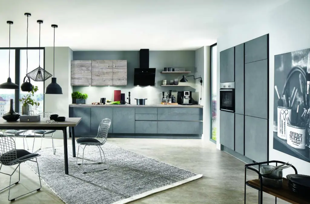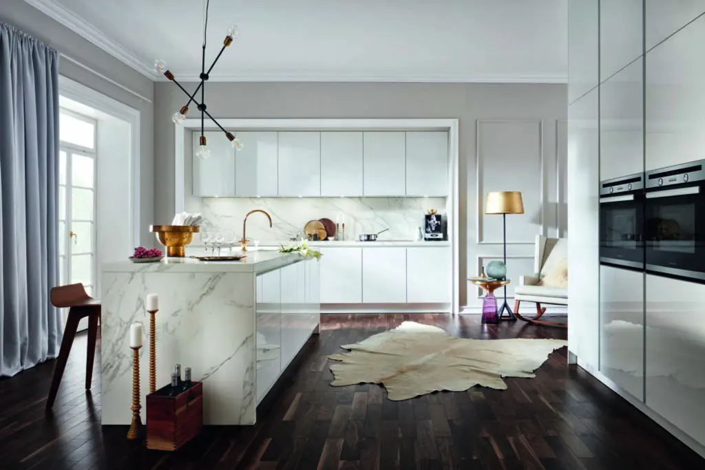 Wählen Sie beispielsweise ein griffloses Modell, das eine zeitlose und geradlinige Optik ermöglicht. Die Fronten sind meist glatt, matt oder Hochglanz lackiert, mit Stein- oder Betonoptik oder furnierten Holzfronten. Man arbeitet mit verschiedenen Designelementen wie geraden Linien, kubischen oder eventuell schwebenden Elementen. Die Hochschränke können in die Wand versenkt werden. Die Griffe werden in einer grifflosen Küche in den Korpus eingefräst: man greift zum Öffnen einfach hinter die Front. Außerdem sind grifflose Küchen mit einem Druckmechanismus möglich: man drückt zum Öffnen auf die Front. Außerdem werden moderne Küchen oftmals mit Relinggriffen ausgestattet, welche in systematischer Anordnung angebracht werden.